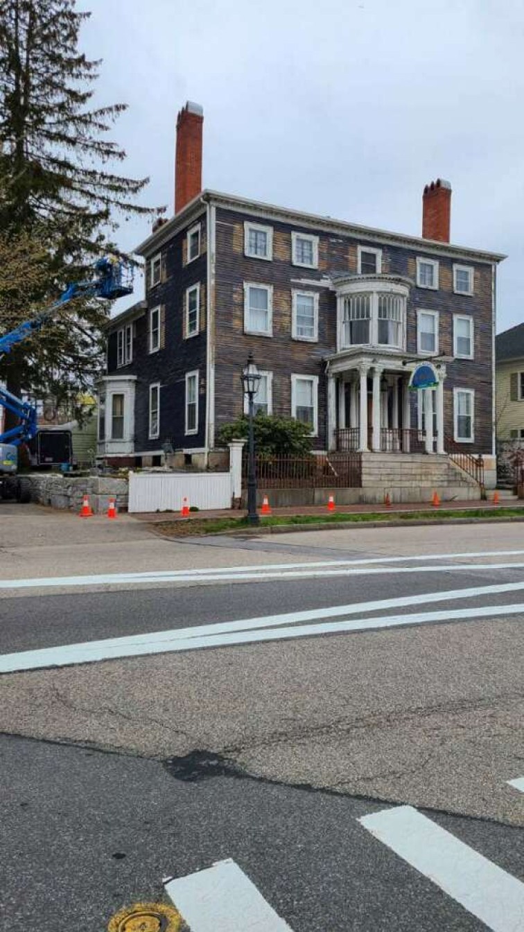 The property at 116 middle street Portsmouth is another colonial era home 1799 build it had still some original scarf jointed cedar clapboards so we did a full hand washing with Zep 5F5 bleech free cleaner and a full scrape of all surface to remove all loose or peeling paint we then used Mad Dog Clear high build adhesion primer which builds up newly prepped surface too reduce scarring from the 250 years plus of paints and stains & lead paint applications. We then repaired any rotten wood and sprayed two top coats with a new product from Sherwin Willams Lattitude which is safe to use within a 30 minute of rain definitely necessary for New England spring season.
